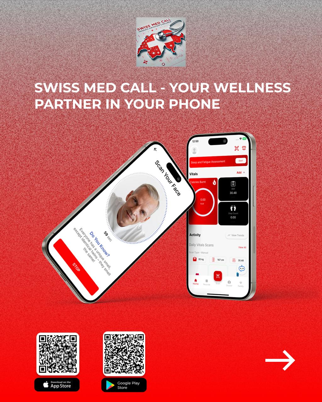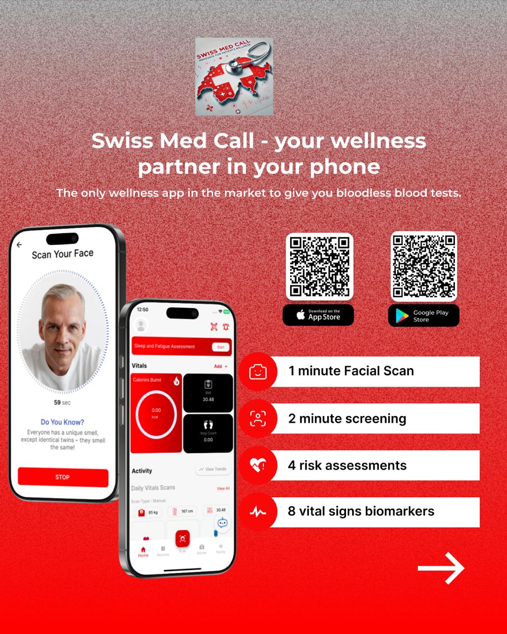 L’application SwissMedCall.AI est basée sur l’intelligence artificielle applicative avec comme support une technologie de pointe qui permet par un face scan ( analyse du visage) d’environ 60 secondes d’évaluer une vingtaine de constantes biologiques (voir le détail sur notre site web : www.swissmedcall.ai).
